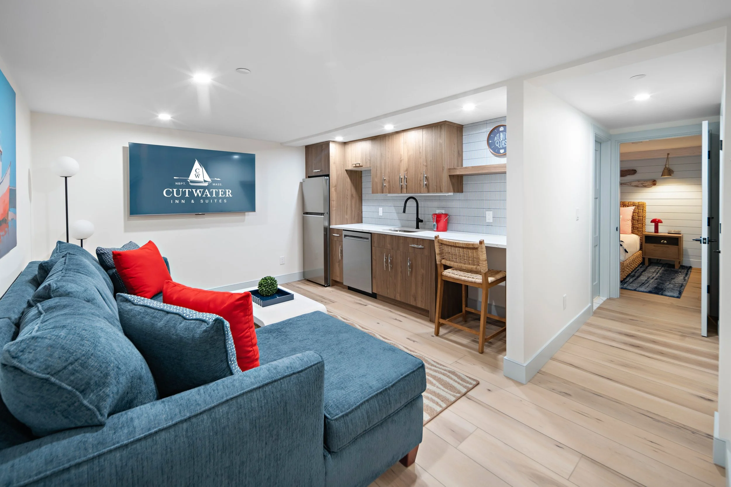 Our largest suite, the Captain's Quarters, captures the essence of the Cutwater Inn. Each room is thoughtfully curated with coastal style. Guests will enjoy a large kitchen (no stove) and a spacious living room in this lovely suite for six.